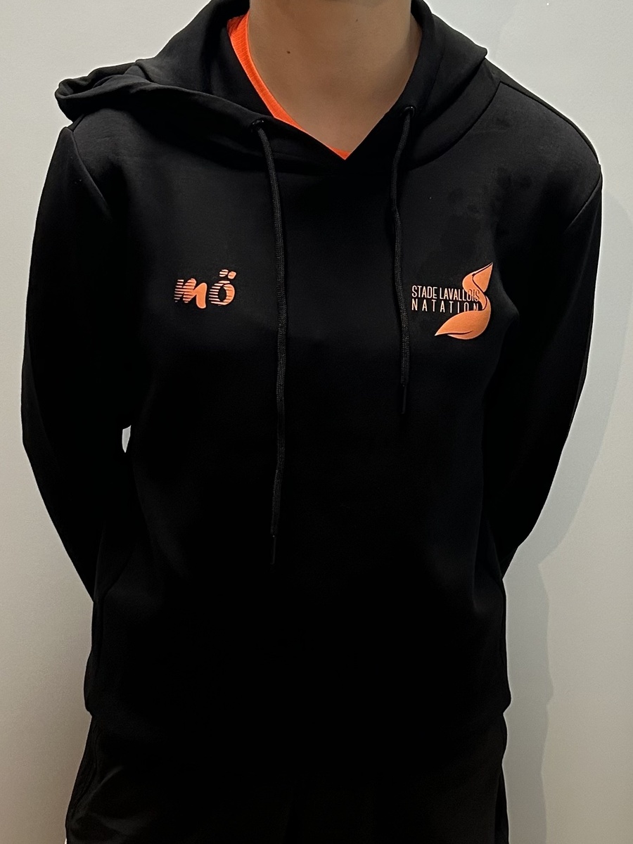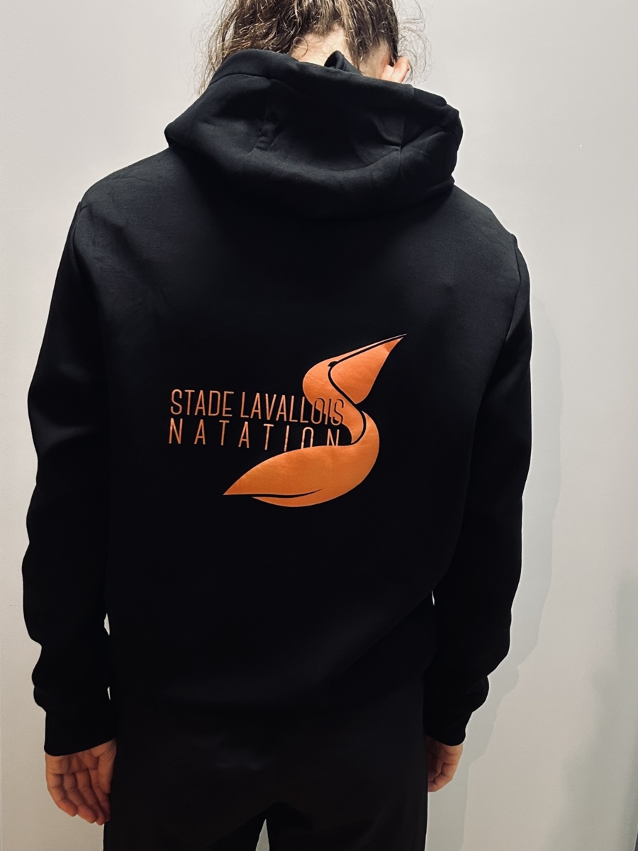 Sweat polyester/coton noir à capuche avec flocage cœur et dos.
