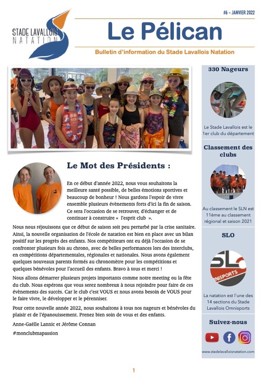 pdf Newsletter Le Pélican - Janvier 2022 Télécharger le document pdf Lettre d'information du Stade Lavallois Natation N°6 - Janvier 2022